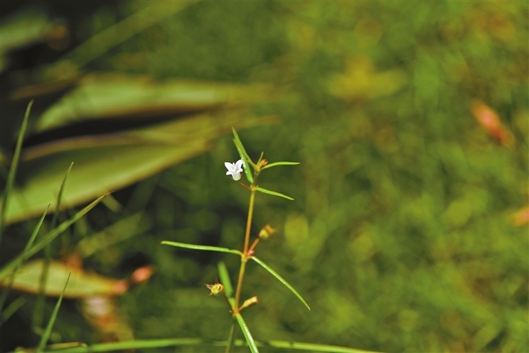 白花蛇舌草 摄于松坪山,常见植物,全年开花。一年生、披散、纤细、无毛草本;叶无柄,线形,先端短尖,上面中脉凹下,侧脉不明显;花单生或双生叶腋,萼筒球形,花冠白色,筒状雄蕊生于冠筒喉部,花药伸出。
